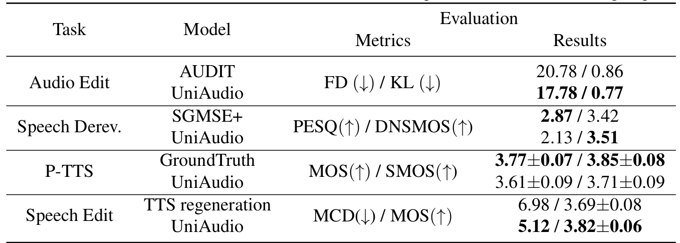 - Audio edit, Speech dereverberation, prompt TTS, Speech edit task에 대해서도 fine-tuned UniAudio는 기존보다 우수한 성능을 달성함