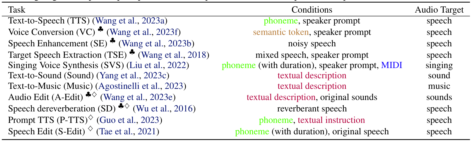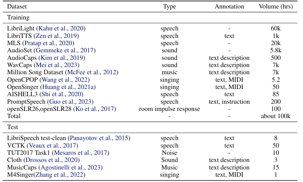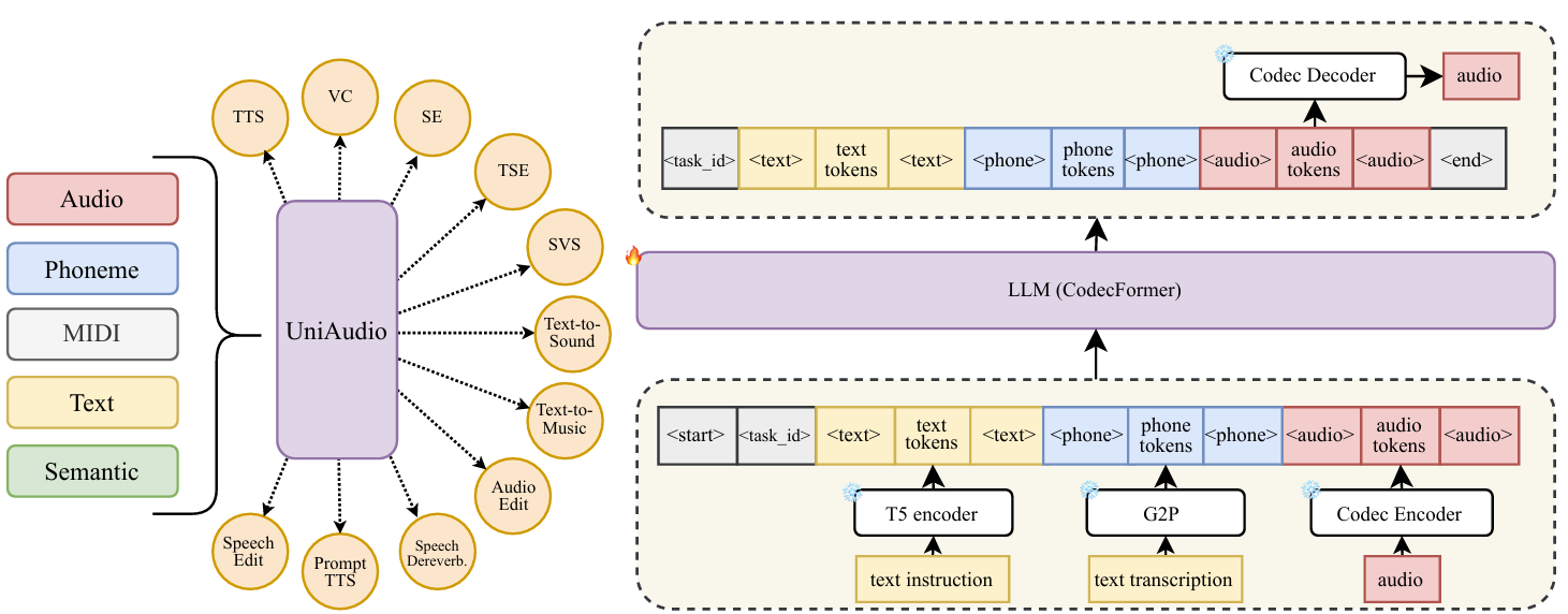 - Large Language Model-based audio generation model을 구성해 phoneme, text description, audio 등의 다양한 input condition을 기반으로 speech, sound, music, singing voice 등을 생성