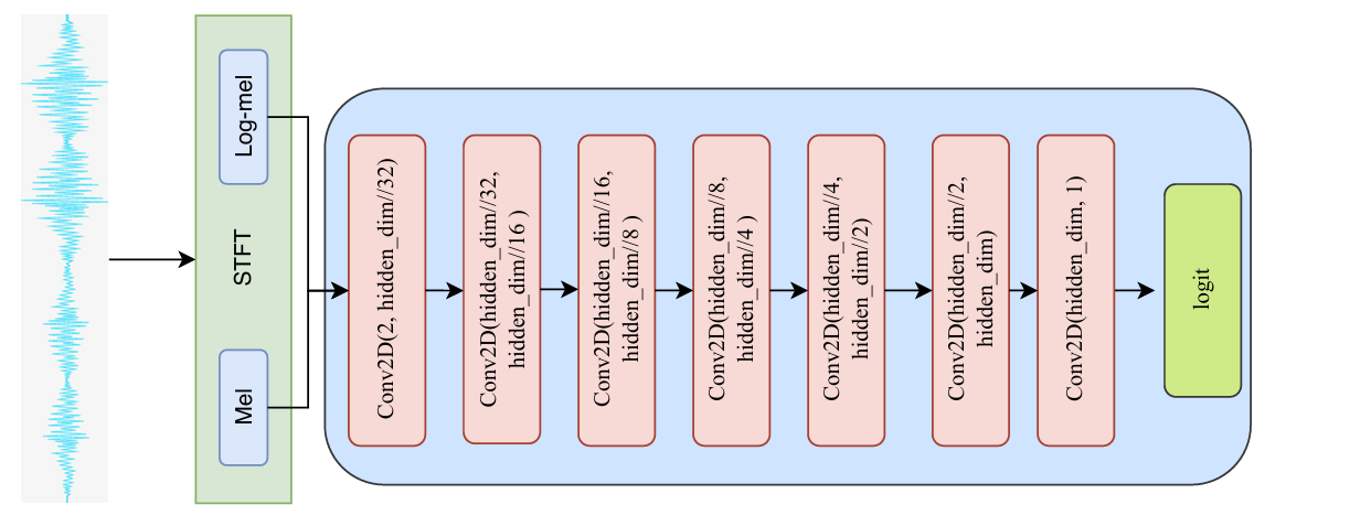- 이를 위해 UniAudio는 EnCodec의 encoder-decoder framework를 기반으로 mel-based discriminator와 sub-band STFT reconstruction loss를 적용하여 codec model을 구성함