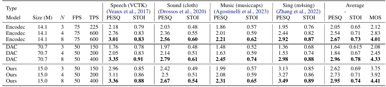 - 결과적으로 해당 codec model은 4가지 audio type에서 가장 뛰어난 성능을 달성하는 것으로 나타남