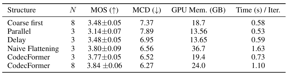 - 특히 auto-regressive property를 활용한 CodecFormer는 naive flattening prediction 수준의 성능을 달성함