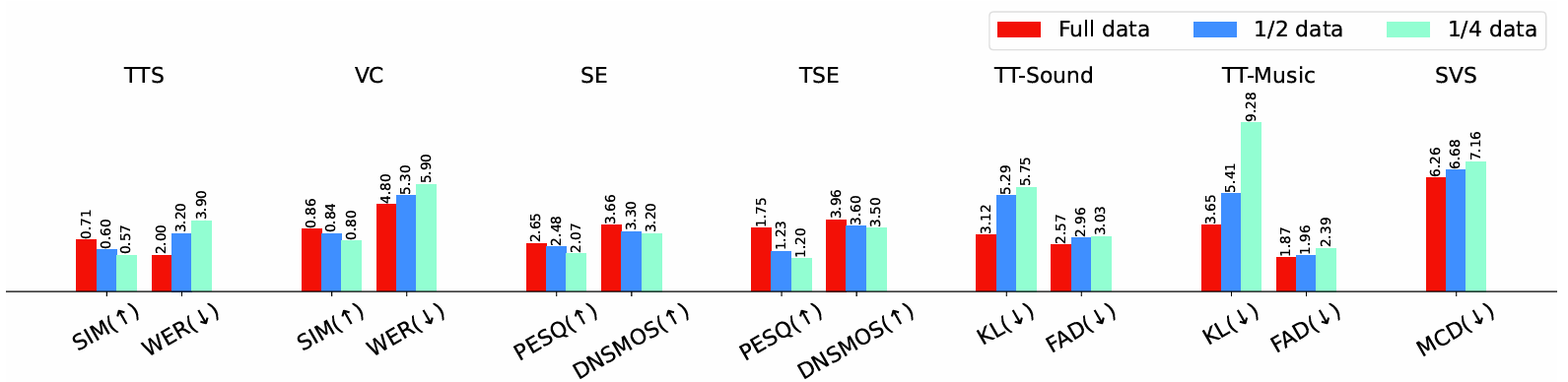 - Training data scale이 감소할수록 UniAudio의 성능도 저하됨