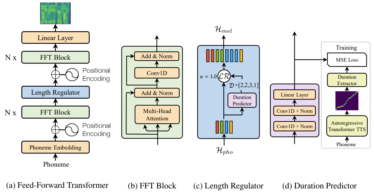 - Phoneme과 mel-spectrogram 시퀀스 사이의 length gap을 length regulator로 연결 - Self-attention network는 cross-position 정보를 추출하기 위한 multi-head attention으로 구성