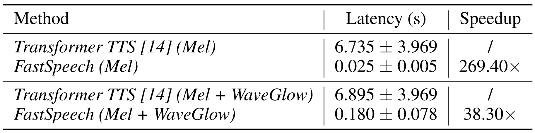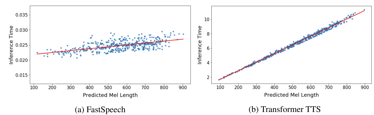 - FastSpeech는 예측된 mel-spectrogram 길이에 따라 추론 latency가 거의 증가하지 않음