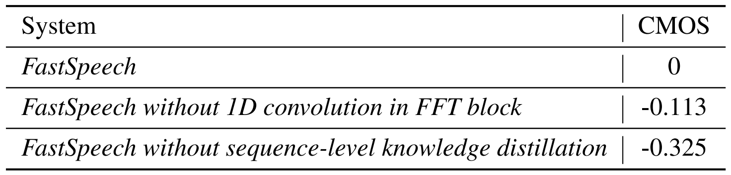 - 1D convolution 대신 fully-connected layer를 사용한 경우, -0.113 CMOS를 달성해 성능 저하를 보임 - Sequence-level Knowledge Distillation
