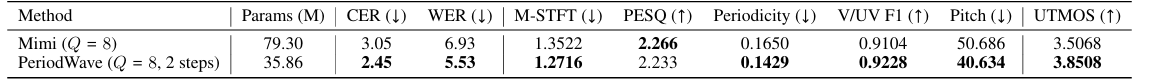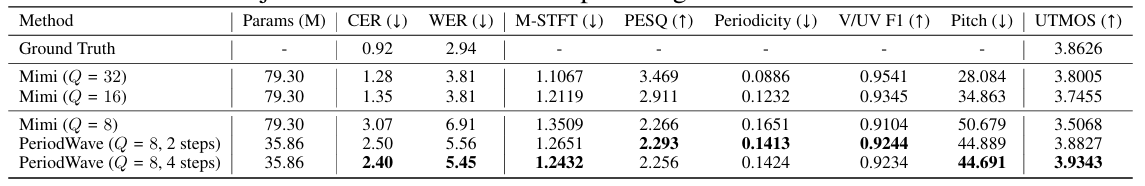 - Discrete token coding 측면에서도 PeriodWave는 뛰어난 성능을 보임