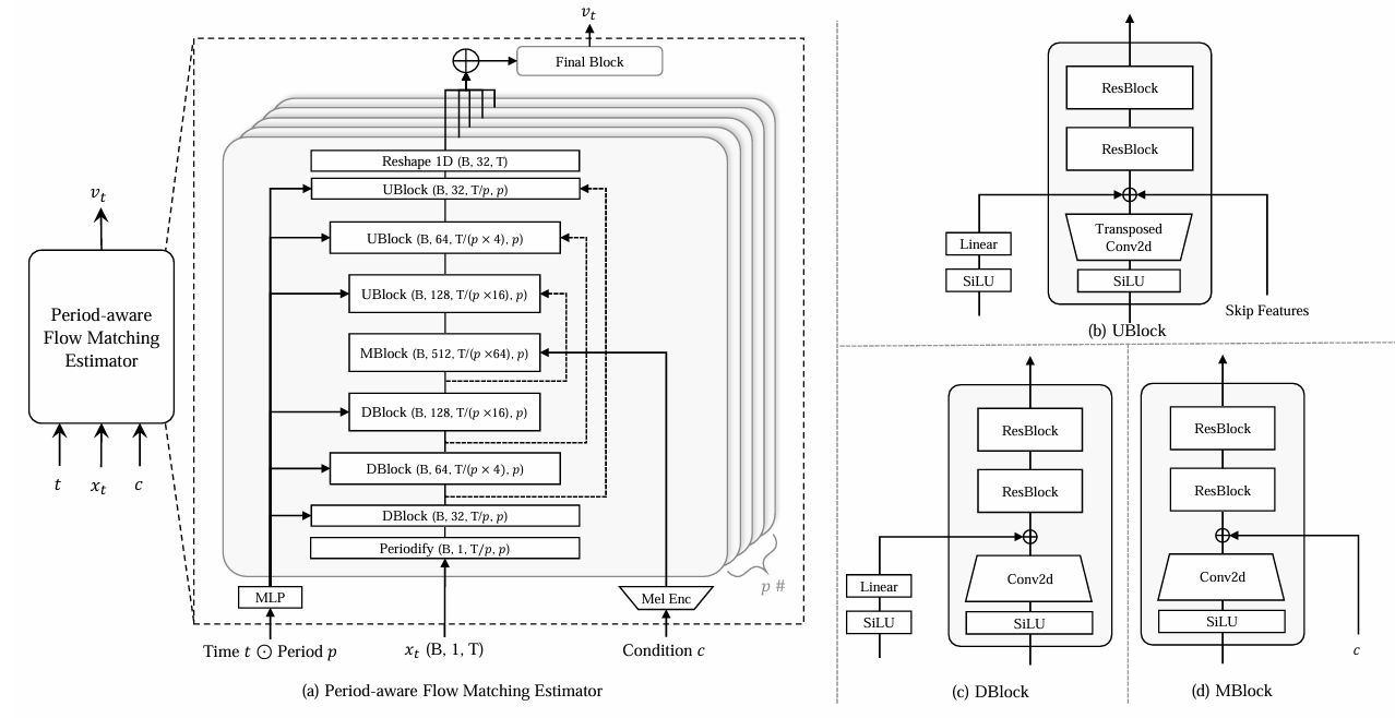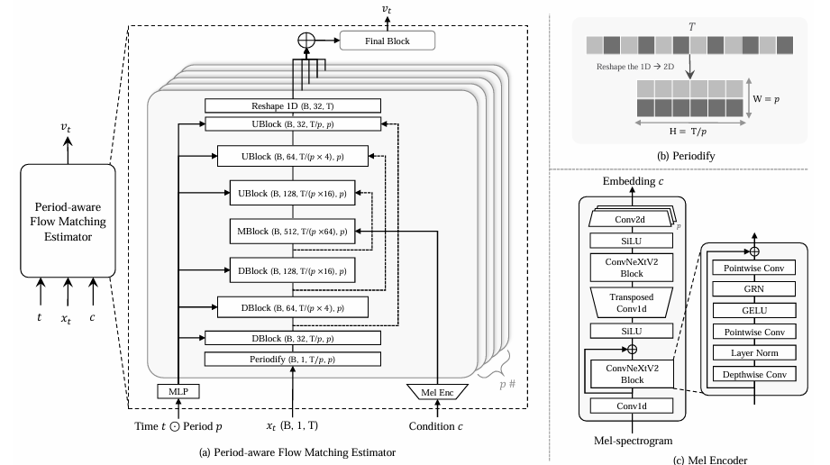 - 특히 논문은 기존 Vocos에서 채택된 ConvNeXt 대신 ConvNeXt-V2 block을 활용하여 Mel encoder를 구성하고, 해당 block output을 Period-Aware Flow Matching Estimator에 전달함