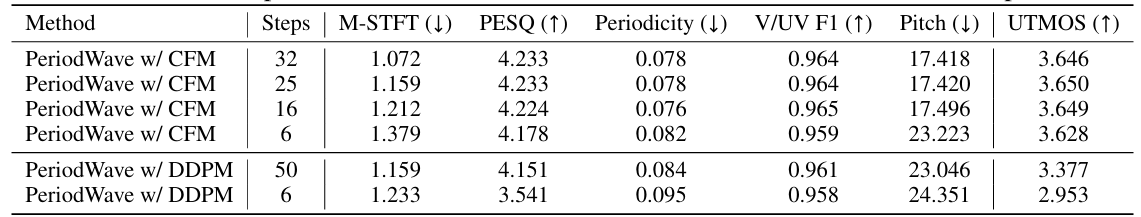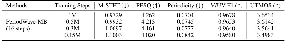 - Training step이 증가할수록 PeriodWave의 성능도 증가함