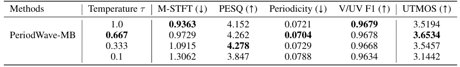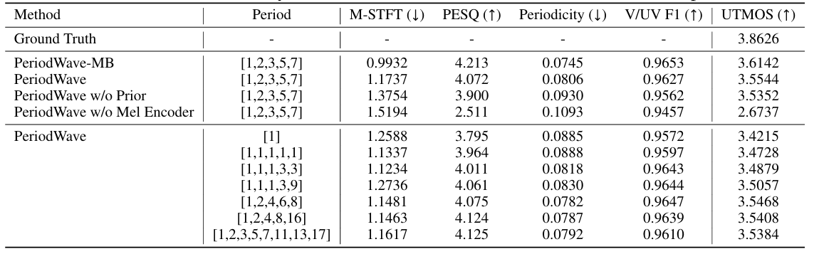 - 특히 $[1,2,3,5,7]$과 같은 prime number의 period를 사용하는 경우 UTMOS를 보다 향상할 수 있음