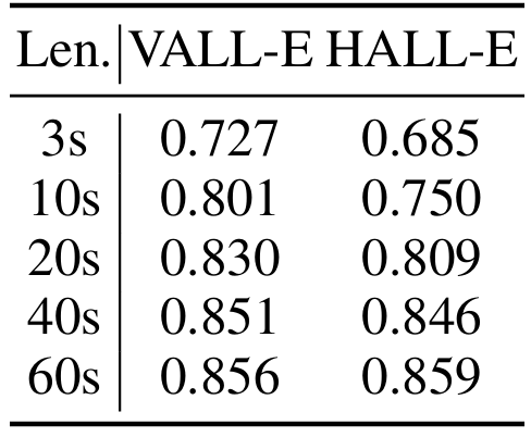 - HALL-E는 audio length가 길어질수록 뛰어난 성능을 보임