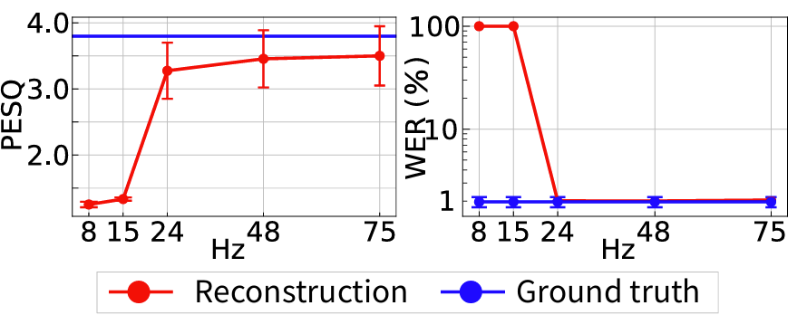 - BUT, frame rate를 48Hz 미만으로 reduce 하는 경우, 아래 그림과 같이 speech reconstruction 성능이 크게 저하됨