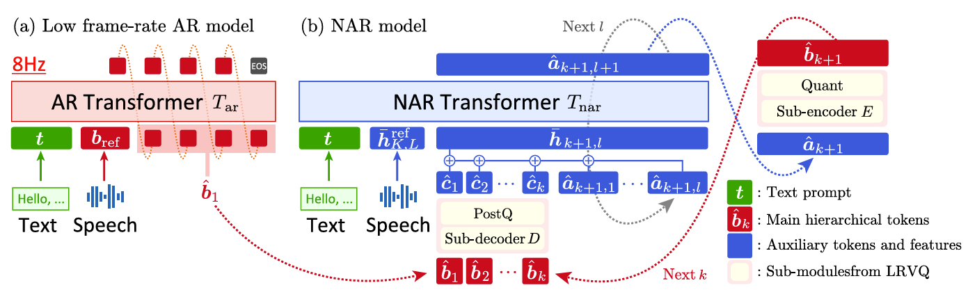 - $T_{ar}$ : AR transformer decoder, $b_{1}^{\text{pr}}$ : first LRVQ block에서 얻어지는 audio prompt