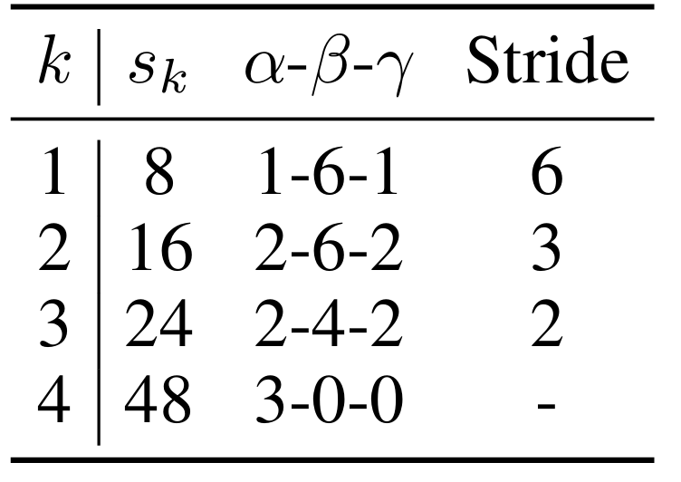 - HALL-E의 frame rate $s_{k}$, hyperparameter triplet $\alpha-\beta-\gamma$, convolution/transposed convolution layer의 stride는 아래 표와 같음