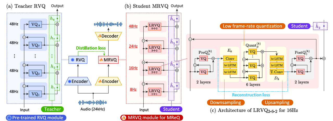 - 이때 high frame rate로 pre-train 된 NAC model이 teacher model로 사용됨 - 먼저 teacher embedding을 frozen RVQ module에서 추출한 다음, student embedding을 MRVQ module에서 추출하고, Feature-Level Distillation (FLD) loss, Hidden-State Reconstruction (HSR) loss를 minimize 함