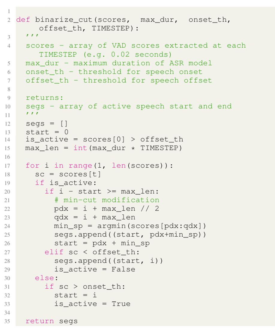 - 이를 위해서는 active speech segment length가 ASR model의 maximum input duration을 넘지 않아야 함 - 따라서 논문은 binary post-processing의 smoothing stage에서 Min-Cut operation을 사용하여 active speech segment duration에 대한 upper bound를 제공함