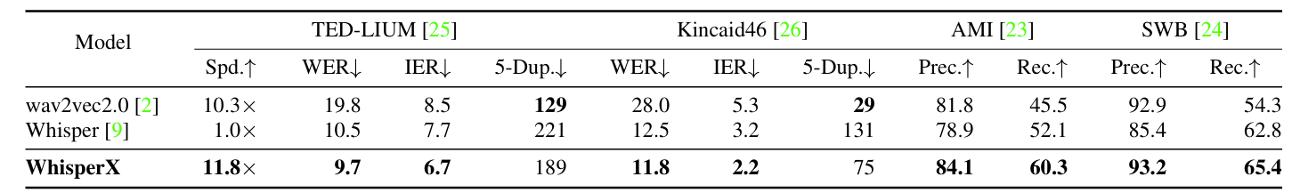 - 전체적으로 WhisperX의 성능이 가장 뛰어남
