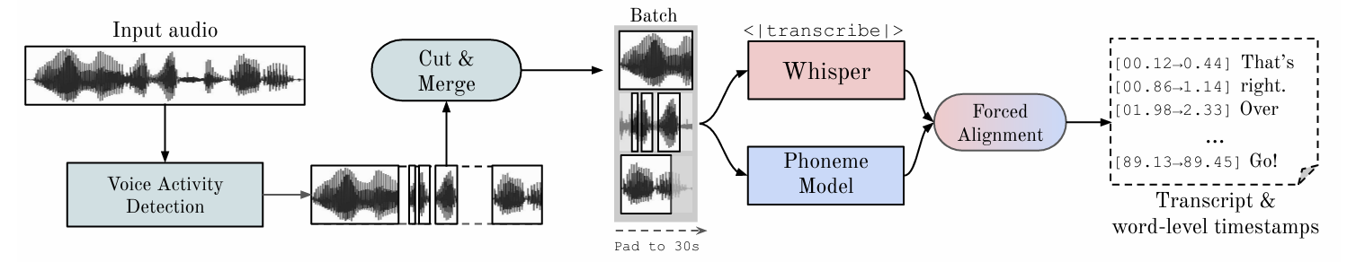 - VAD와 word-level forced alignment를 활용하여 기존 Whisper를 개선