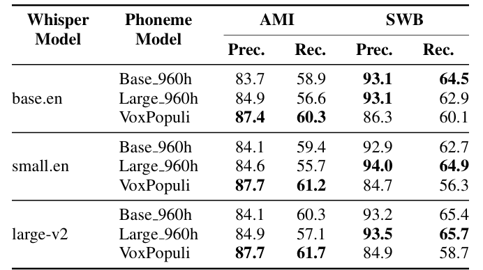 - Larger Whisper model을 사용할수록 precision, recall 모두 향상됨