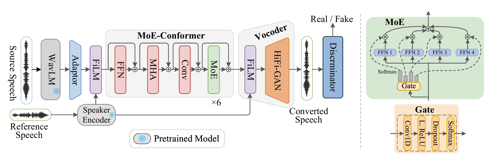 - ExVC는 2개의 FiLM module 사이에 MoE-enhanced Coformer module stack을 sandwich 하고 HiFi-GAN vocoder를 추가하여 구성됨