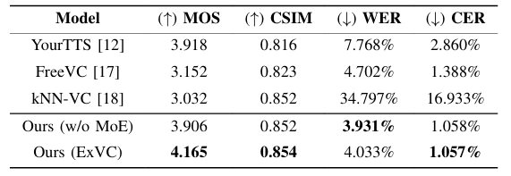 - CSIM, WER, CER 측면에서도 ExVC가 가장 우수함