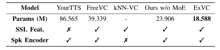 - ExVC는 FreeVC 보다 52% 적은 parameter 수를 가짐