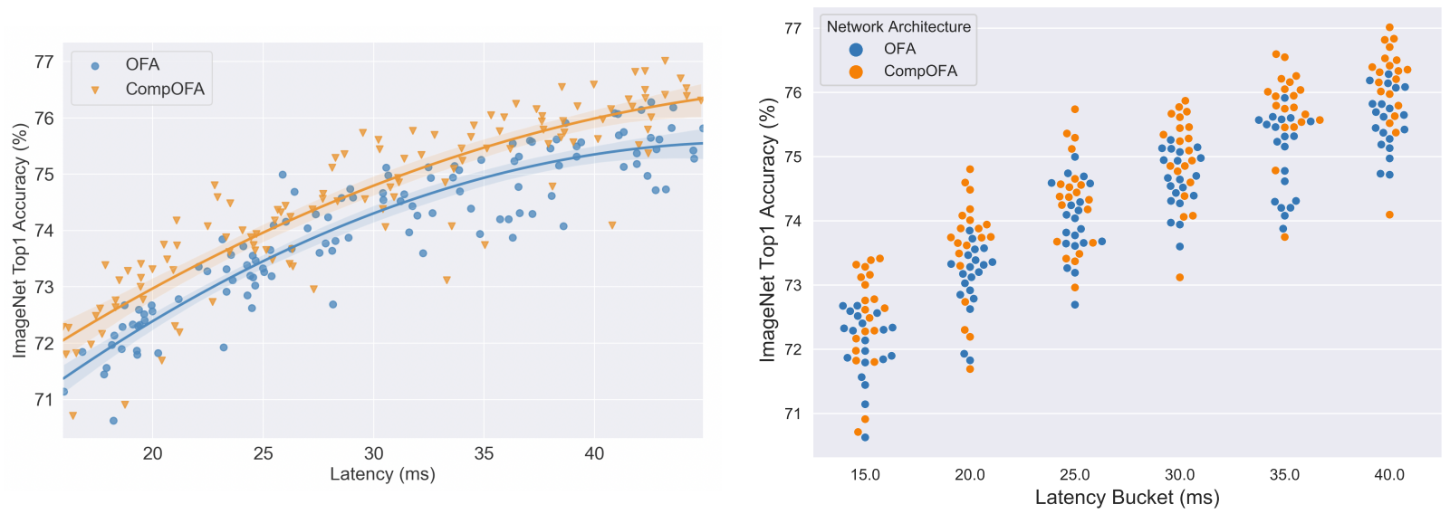 - CompOFA의 search space에 더 정확한 모델 구성이 집중되어 있음을 의미