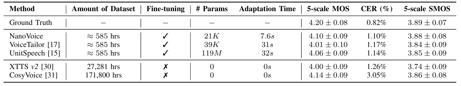 - NanoVoice는 21K의 parameter와 585 hours의 dataset 만으로 CosyVoice 수준의 합성 품질을 달성함