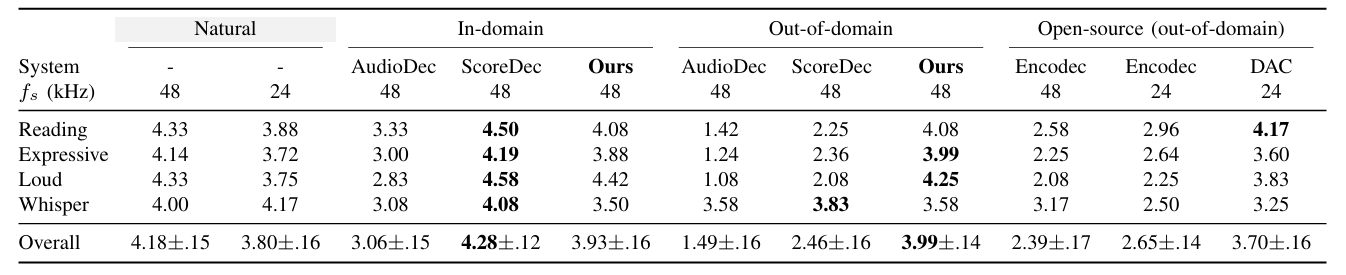 - 24kbps bitrate의 ComplexDec은 16개의 10-bit codebook을 (8-real/8-imaginary) 사용한 down/upsampling layer가 없는 RVQAE architecture를 활용함