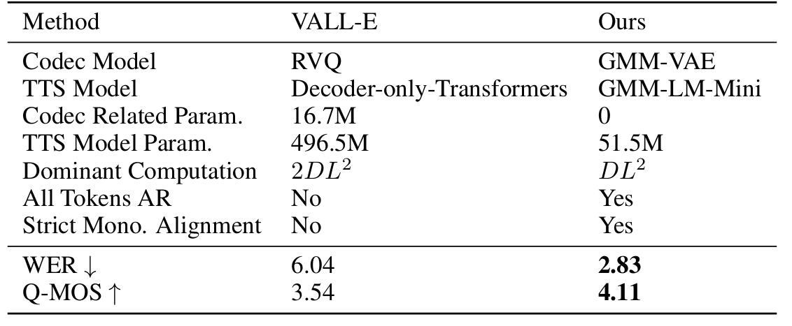 - 이후 text에 따라 compressed acoustic vector를 autoregressively modeling 하는 Gaussian Mixture Model-Language Model (GMM-LM)을 도입