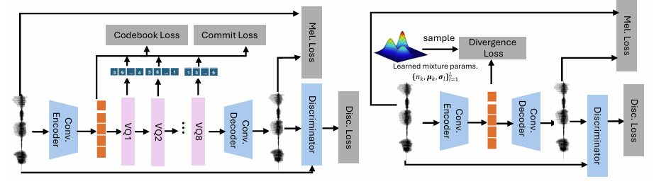 - 특히 speech signal에 대해 GMM-VAE를 training 할 때, reconstruction term을 mel-spectrogram reconstruction loss로 replace 하고 EnCodec, DAC를 따라 discriminator를 추가함