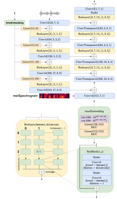 - Function $v(x,t)$는 19.5M parameter의 asymmetric U-Net model을 기반으로 HiFi-GAN의 multi-receptive field module을 채택함