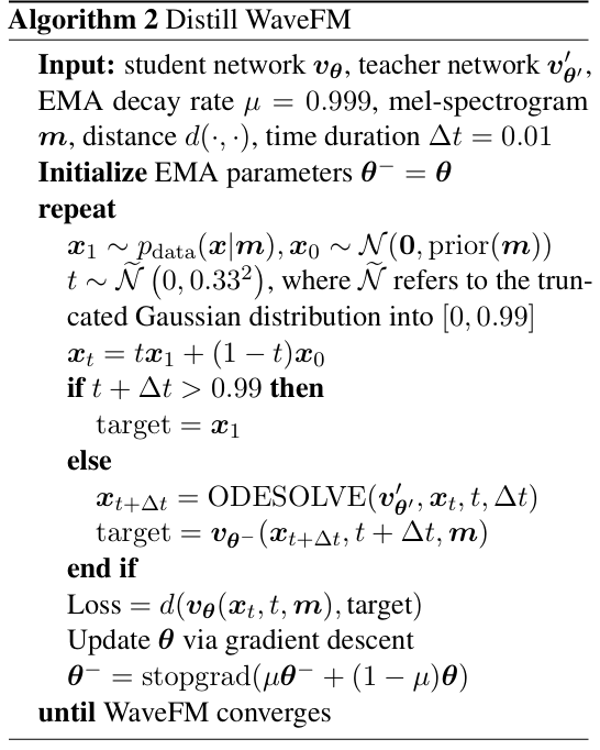 - Waveform이 already sufficiently clean 하므로 large $t$는 효과적이지 않기 때문 - 결과적으로 WaveFM training은 [Algorithm 1]과 같이 수행됨