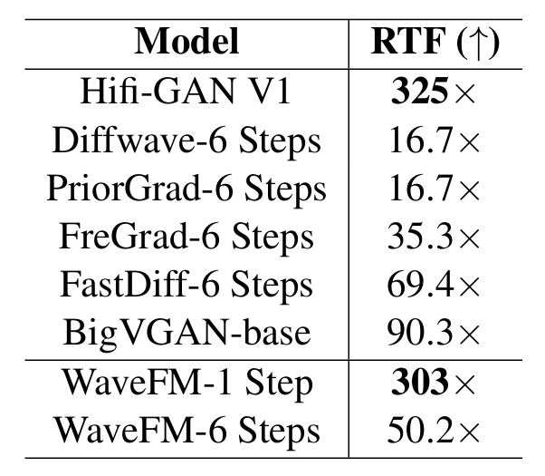 - WaveFM은 HiFi-GAN 수준의 Real Time Factor (RTF)를 달성할 수 있음