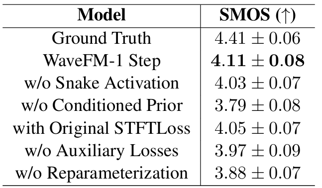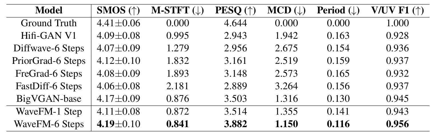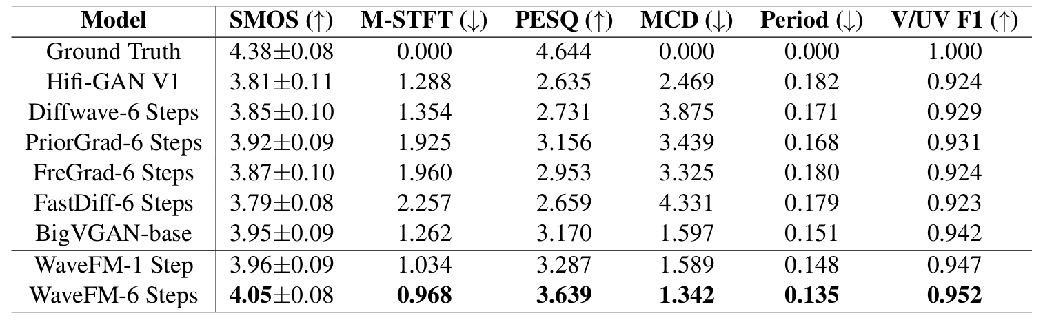 - LibriTTS dataset에 대해 WaveFM이 가장 뛰어난 성능을 보임