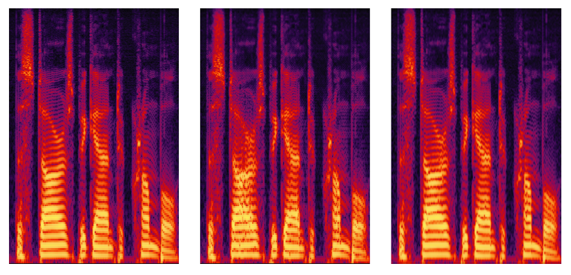 - 특히 아래 그림과 같이 original loss를 사용하여 생성된 spectrogram은 WaveFM의 spectrogram에 비해 lower accuracy를 보임 - 추가적으로 second auxiliary loss function으로 mel-spectrogram의 average $L1$ loss를 채택해 quality를 향상함