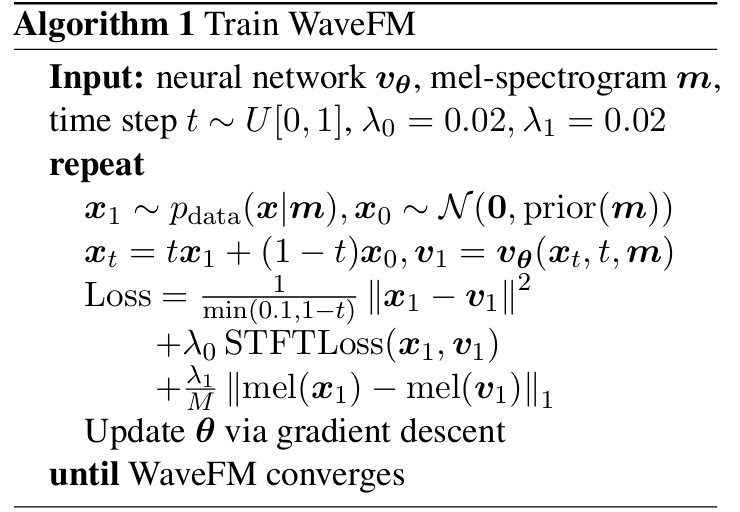(Eq. 18) $\min_{v'}\left(\frac{1}{1-t}\mathbb{E}|| x_{1}-v'(x_{t},t)||^{2}+\lambda_{0}\mathbb{E}[\text{STFTLoss}(x_{1},v'(x_{t},t))]+\lambda_{1}\mathbb{E} \frac{|| \text{mel}(x_{1})-\text{mel}(v'(x_{t},t))||_{1}}{M}\right)$