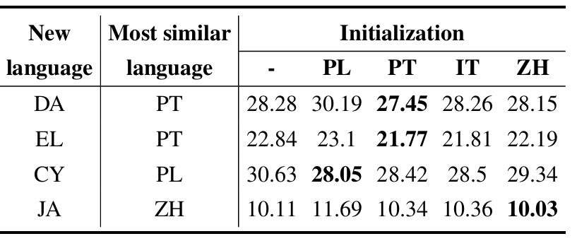 - LoRA-warm start의 경우, new LoRA matrix는 most similar language의 LoRA matrix로 initialize 됨