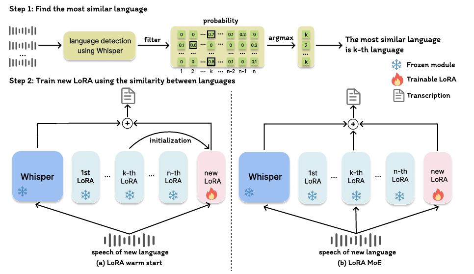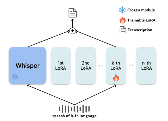 - 먼저 각 language에 대해 language-specific LoRA matrix가 Whisper의 encoder, decoder에 append 됨