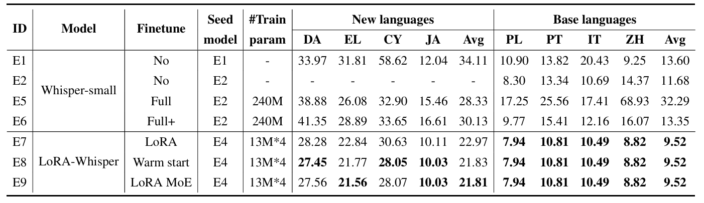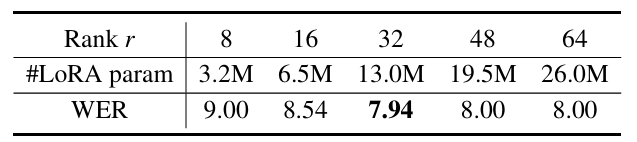 - 즉, language 간 shared information은 Whisper model에 store 하고 각 LoRA matrix는 language-specific information을 capture 함 - New language incorporating 시에는 new LoRA matrix를 assign 하여 existing language의 성능 저하를 회피