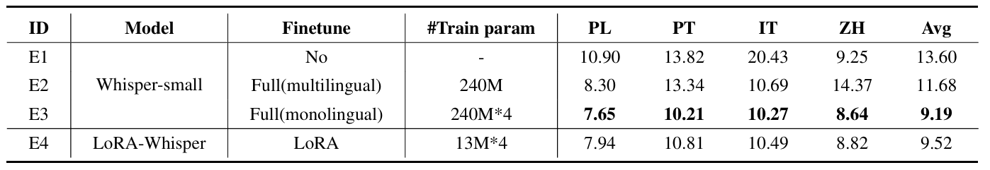 - LoRA-Whisper는 Whisper 보다 더 적은 training parameter로 더 우수한 multilingual ASR 성능을 달성함