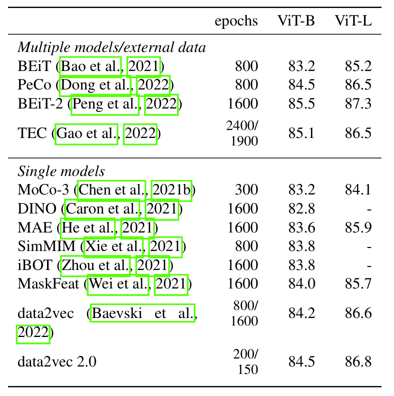 - ViT-B, ViT-L 측면에서 Data2Vec 2.0이 가장 우수한 성능을 달성함