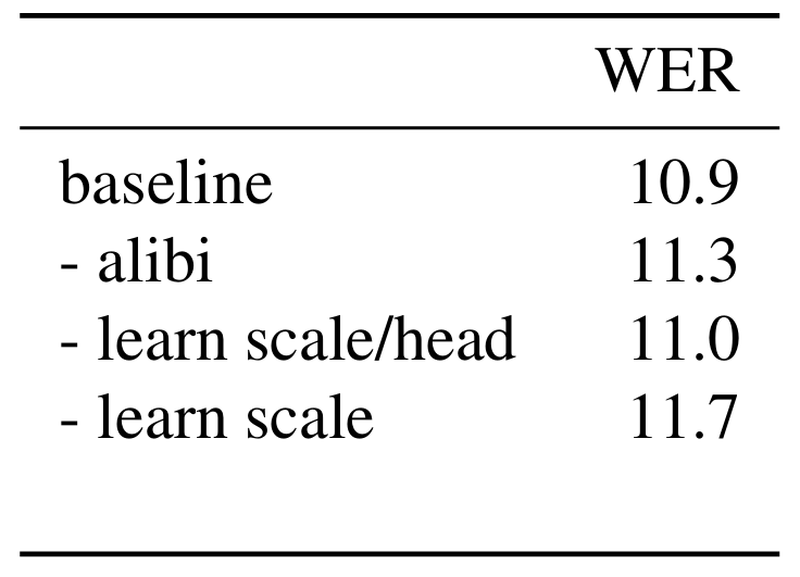 - Alibi Embedding을 제거하는 경우 성능 저하가 발생함