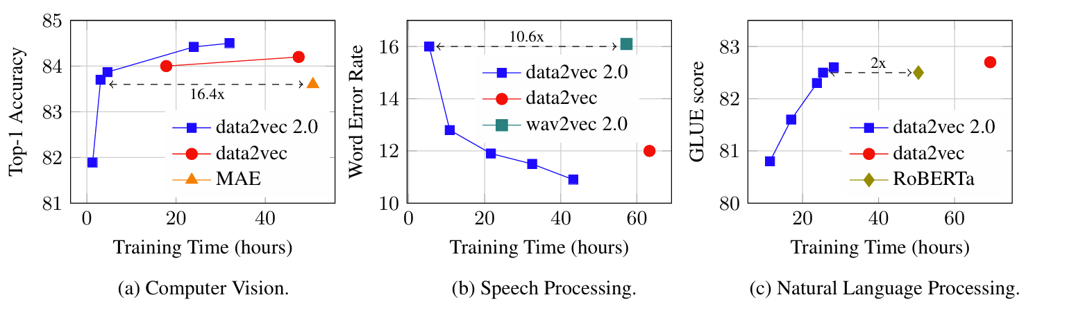 - Data2Vec 2.0은 각 modality에 대해 더 나은 speed, accuracy trade-off를 가짐