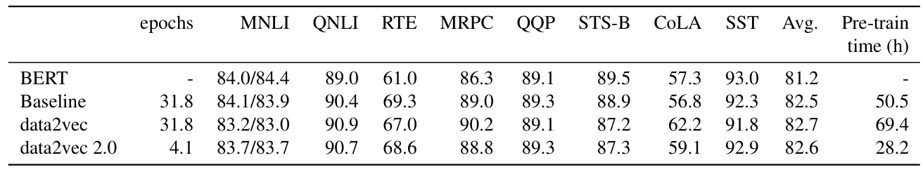 - NLP 측면에서도 Data2Vec 2.0이 가장 우수한 성능을 보임