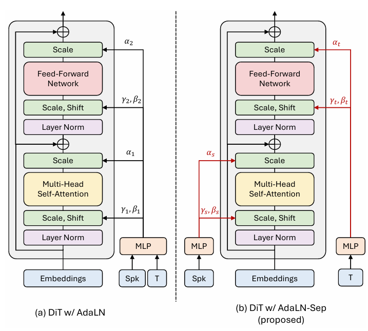 - BUT, AdaLN-Zero는 conditioning information을 함께 처리하므로, 각 feature의 independent characteristic을 fully-reflect 하지 못함 - 따라서 논문은 speaker, time embedding을 separate 하는 AdaLN-Sep를 도입하여 각 conditioning information을 transformer block에 independently integrate 함: