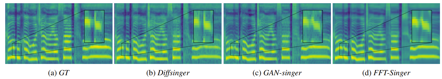 - 생성된 mel-spectrogram을 각각 비교해 보았을 때, DiffSinger는 harmonics 사이에 더 높은 detail을 포함함