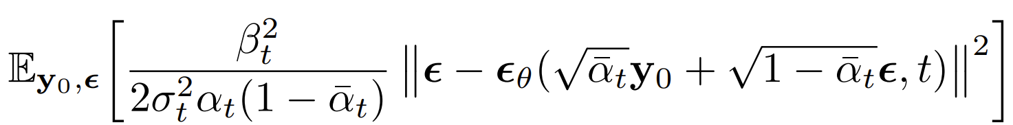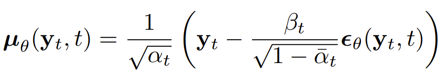 - $\tilde{\mu}_{t}(y_{t}, y_{0}) := \frac{\sqrt{\bar{\alpha}_{t-1}}\beta_{t}}{1-\bar{\alpha}_{t}}y_{0} + \frac{\sqrt{\alpha_{t}}(1-\bar{\alpha}_{t-1})}{1-\bar{\alpha}_{t}}y_{t}$