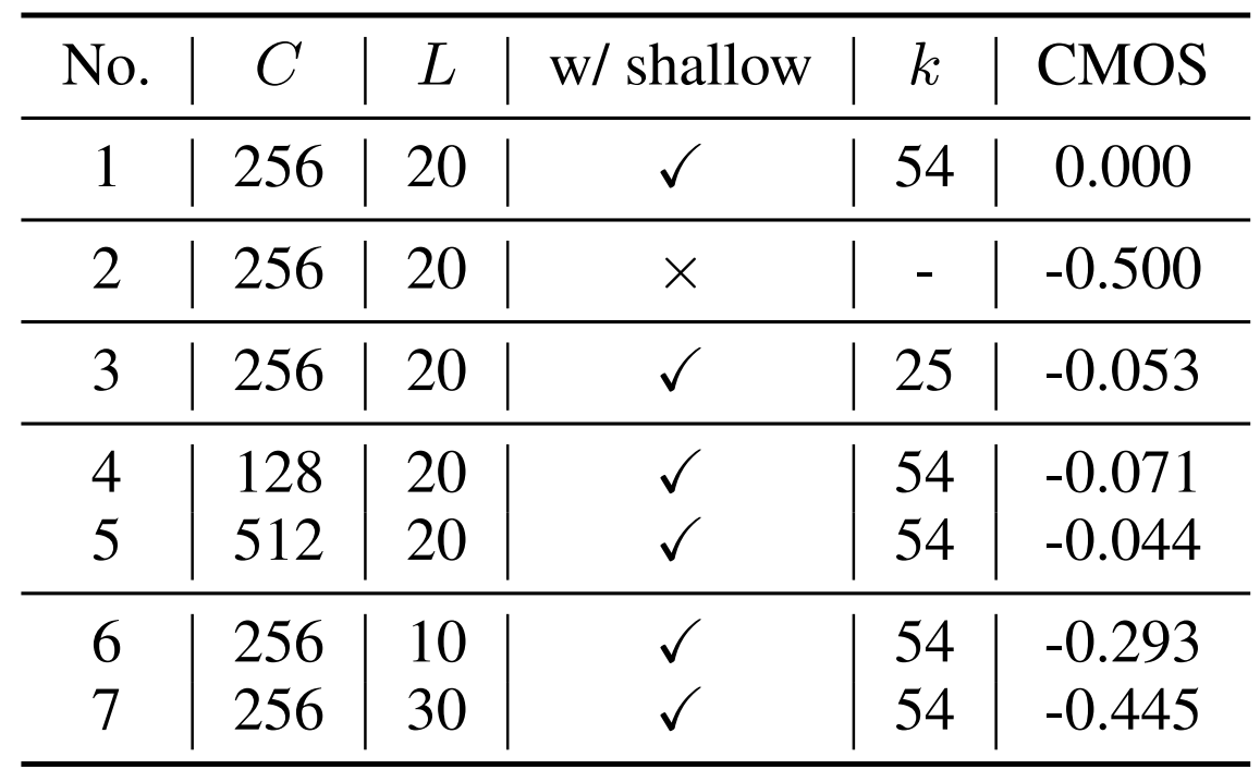 - RTF : real-time factor, 1초에 오디오를 생성하는 데 걸리는 시간 - Shallow diffusion mechanism을 제거하면 -0.500 CMOS의 품질 저하가 발생