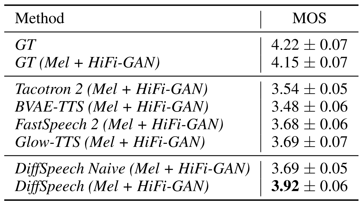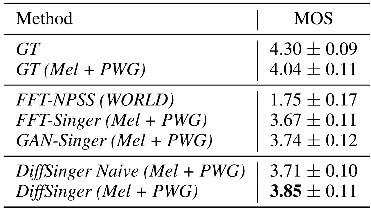 - DiffSinger는 단순 Loss로 학습된 모델이나 GAN 기반 방법들에 비해 우수한 성능을 보임