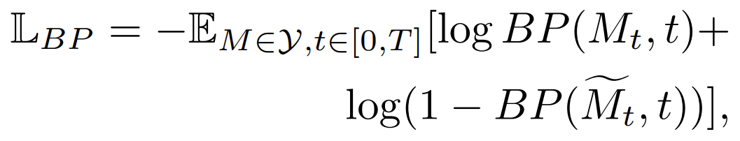 - Diffusion process의 $t$ step에서 입력된 mel-spectrogram이 $M$에서 오는지 $\tilde{M}$에서 오는지 판단 - Training loss $L_{BP}$
